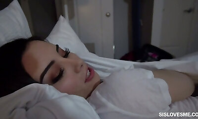 Obscene stepsister Aria Lee plays with stepbrother's man sausage before falling asleep