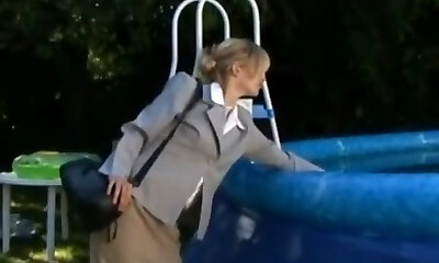 A blonde shoveled the dude into the pool so that he became humid, because her pussy was already dripping